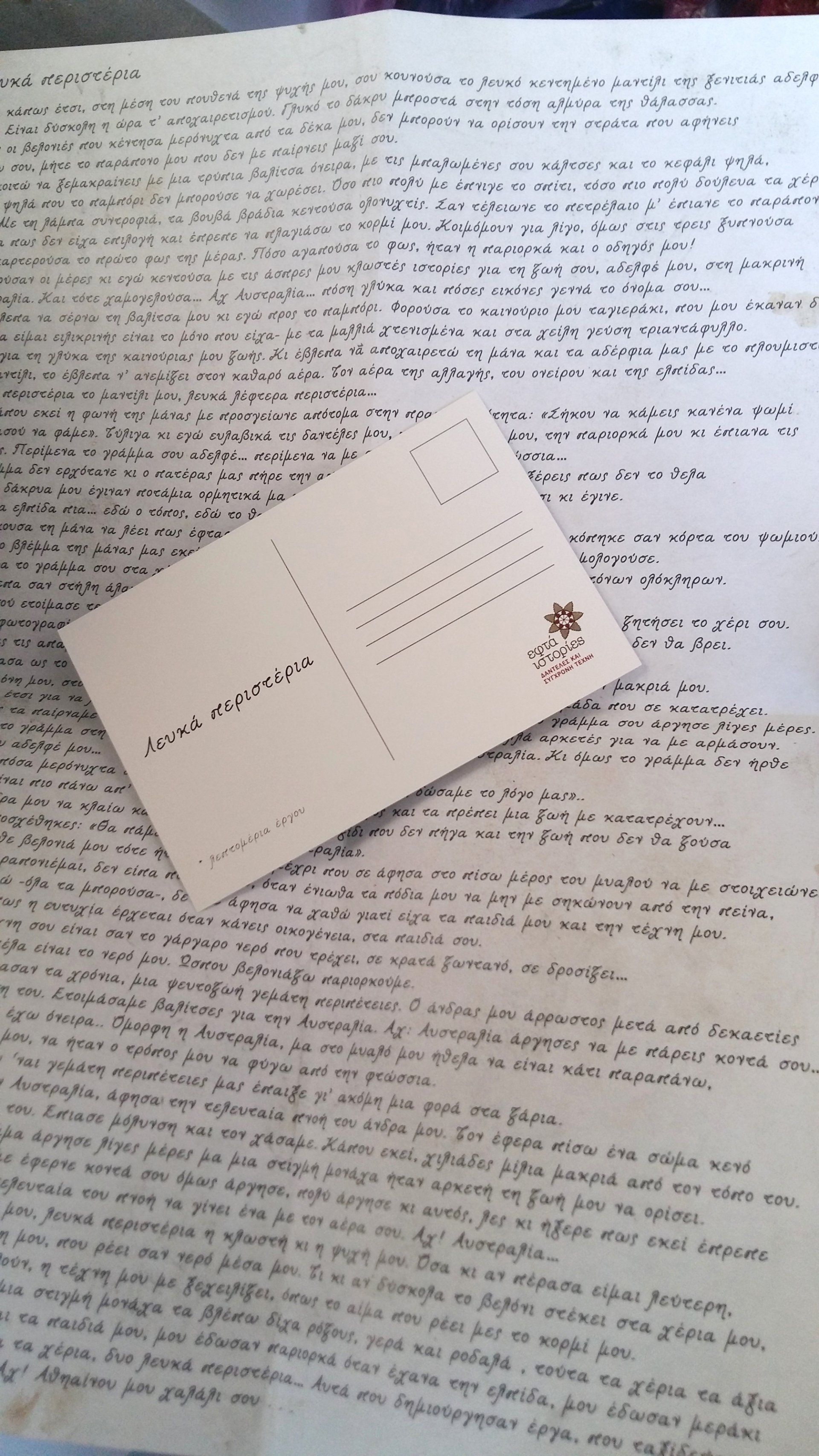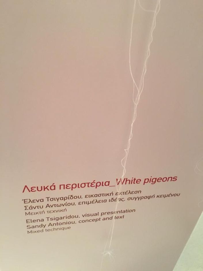 All the art works are based on the narration of weavers of Venitian Lace in Athienou. I collaborated with Sandy Antoniou for this project. The title of our installation is 'White Doves'. Anastasia Sea is 'our' weaver. We met her and interviewed her. Sandy was transformed into Mrs Anastasia Sea and the artwork was based on that photoshoot.